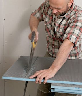 Oikaise levyreunat. Lattia ja seinä kohtaavat vain harvoin suorassa kulmassa. Tämän vuoksi levyt kannattaa leikata hieman viistäen eli leik kaa levyn päädyn alapinnalta enemmän pois kuin yläpinnalta.