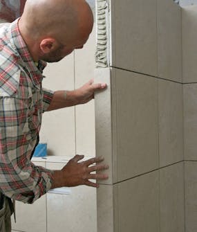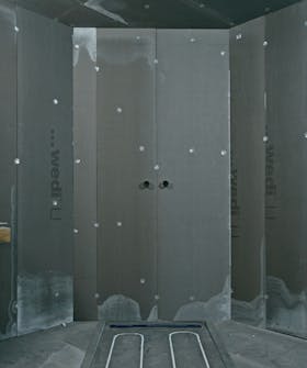 Asennamme kaksi suih-kuseinäkettä ja kulmaam me niitä hieman takaseinään näh den. Tämä näyttää hie-nolta, mutta vaikeuttaa hieman myöhempää laatoitusta, joten päätä itse asennustapa.