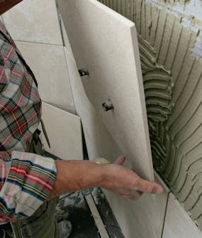 Kiinnitä laatta seinän laastiin. Tarkista, ennen kuin levität laastin, että reiät ovat juuri siinä, missä pitääkin. Siistien reikien teko uuteen laattaan vie hieman aikaa.