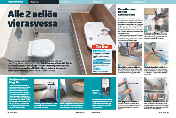 Tässä vierasvessassa ei ole suihkua, lattiakaivoa eikä vesieristystä. Sisäänrakennettu vesisäiliö on kuitenkin tiivistettävä vesivahinkojen välttämiseksi. Tämä voidaan ratkaista joko asettamalla vesisäiliö vesitiiviiseen kasettiin tai tekemällä kalusteen ympärille vesitiivis kotelointi ja lattian rajaan rako varoittamaan vuodoista. Seinään kalustekotelon päälle kannattaa asentaa myös tarkastus- ja huoltoluukku. Näin pääset helposti käsiksi takana oleviin teknisiin asennuksiin.