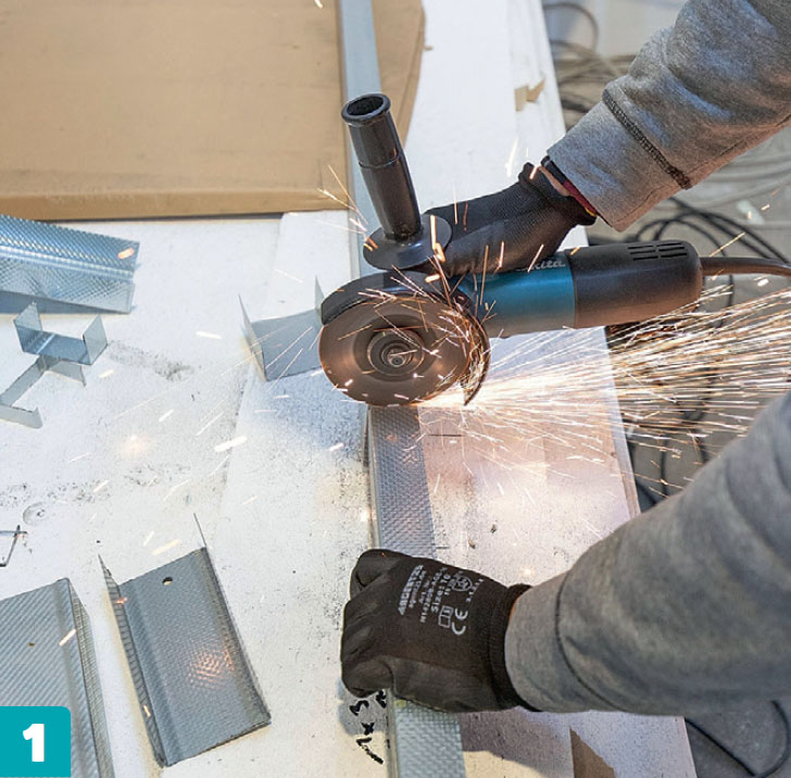 Leikkaa alaprofiilit (U-profiilit) kulmahiomakoneella mittojen mukaan. Tee niistä pari milliä liian lyhyitä ja poista sitten purseet (karheat ja epätasaiset reunat).