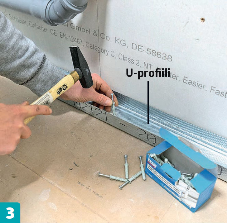 Kiinnitä lattiaan kaksi U-profiilia. Toinen seinän viereen ja toinen tason etureunaan. Profiilit kiinnitetään ruuveilla tai naulatulpilla, kuten tässä. Esiporaus tehdään profiilin läpi lattiaan.