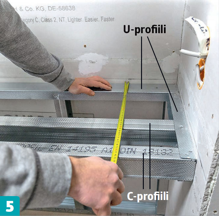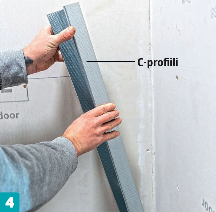 Jatka pystysuorilla C-profiileilla. Ne leikataan mittaansa, upotetaan lattian U-profiileihin ja kiinnitetään seinälevyihin seinämateriaalille sopivilla ruuveilla ja tulpilla.
