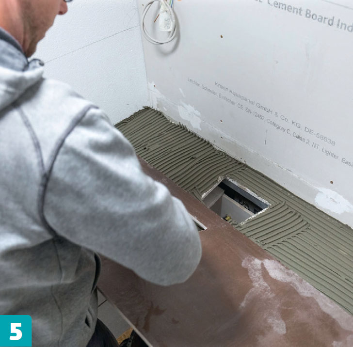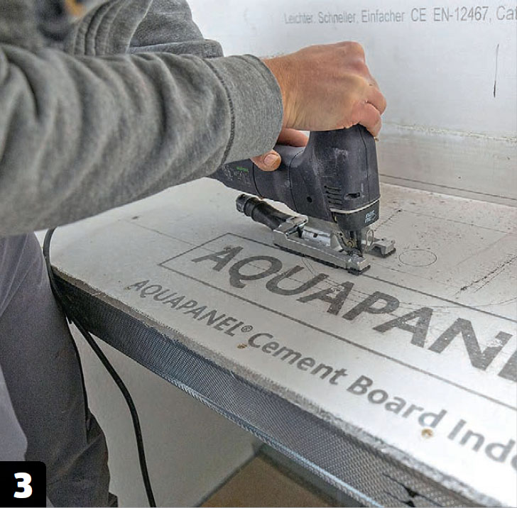 Pesutason laatoilla on oltava tukeva alusta, joka ei saa pettää. Siksi käytämme kuituvahvisteisia sementtipohjaisia levyjä, jotka voidaan leikata mattoveitsellä (suorat leikkaukset) ja karbidikärkisellä pistosahalla (pyöreät leikkaukset).