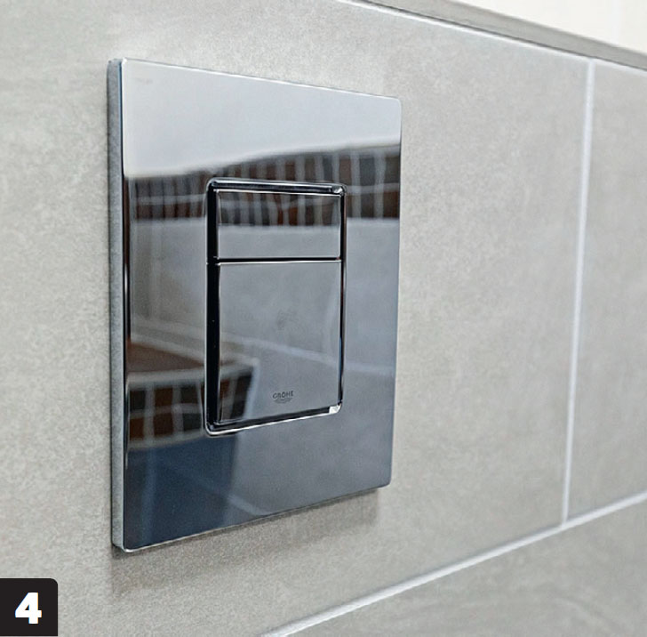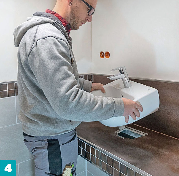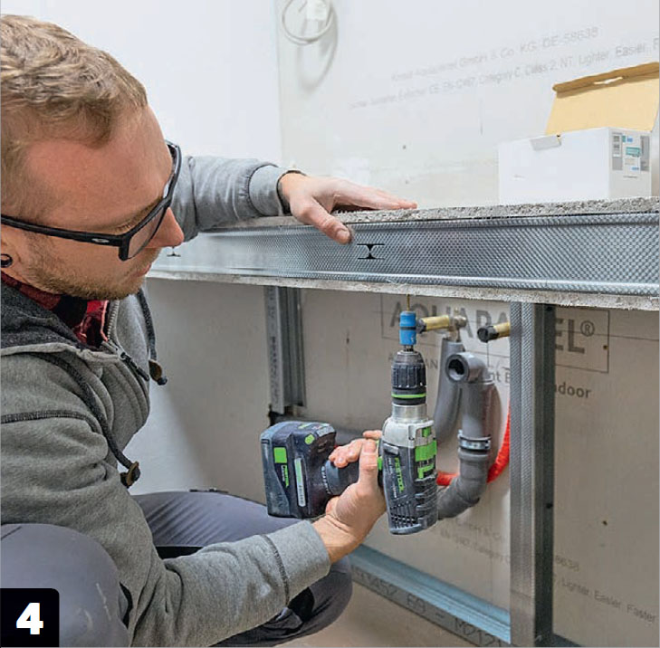 Pienessä vessassa ei ole tilaa kaapeille eikä isolle pesualtaalle. Sen sijaan rakennamme seinästä seinään ulottuvan pesutason samanlaisista teräsprofiileista, joita käytetään kevyiden seinien rakentamiseen. Profiilit päällystetään kuituvahvistetuilla sementtipohjaisilla, niin kutsutuilla Aquapanel-levyillä. Ne ovat täysin vedenkestäviä eivätkä murene tai turpoa.