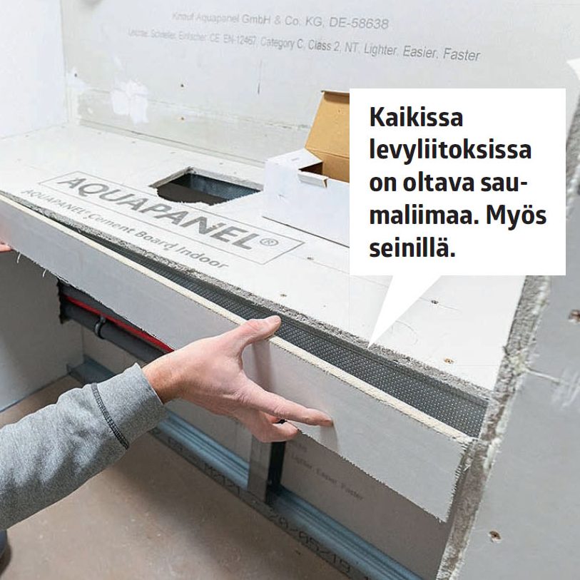 Sauman oikea rakenne. Joustava sauma tulee kiinnittää vain kahdelta sivulta, muuten se irtoaa laatoista. Tämä onnistuu kiinnittämällä saumanauhaa sauman taakse.