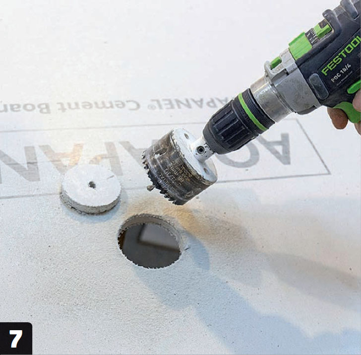 Piirrä laattaan reikä viemäri- ja vesiputkia varten. Sen saa tehtyä tarkimmin alapuolelta levyjen aukkojen läpi.