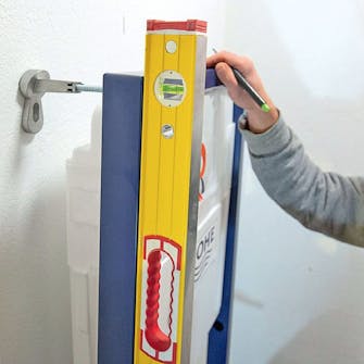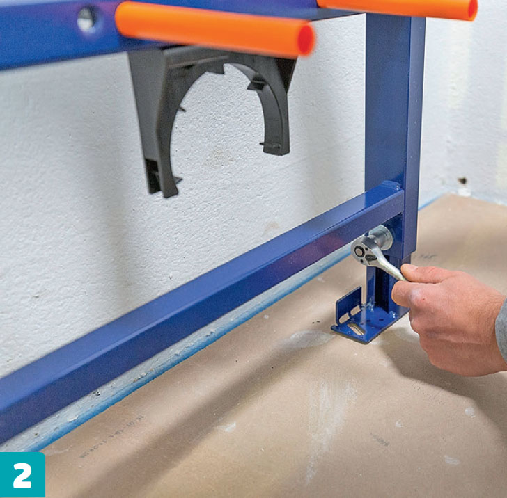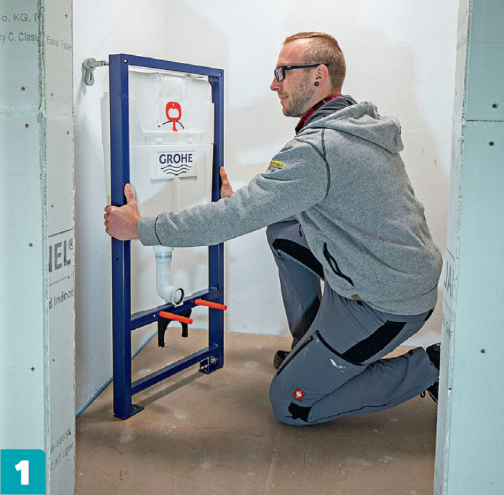 Kehys nostetaan paikalleen. Kalusteyksikkö tulee valmiiksi asennettuna, joten vesisäiliö on jo paikallaan. Tässä selvitetään kehyksen oikeaa korkeutta, sijaintia ja kiinnitystä ennen teknisten asennusten tekemistä.