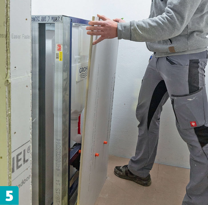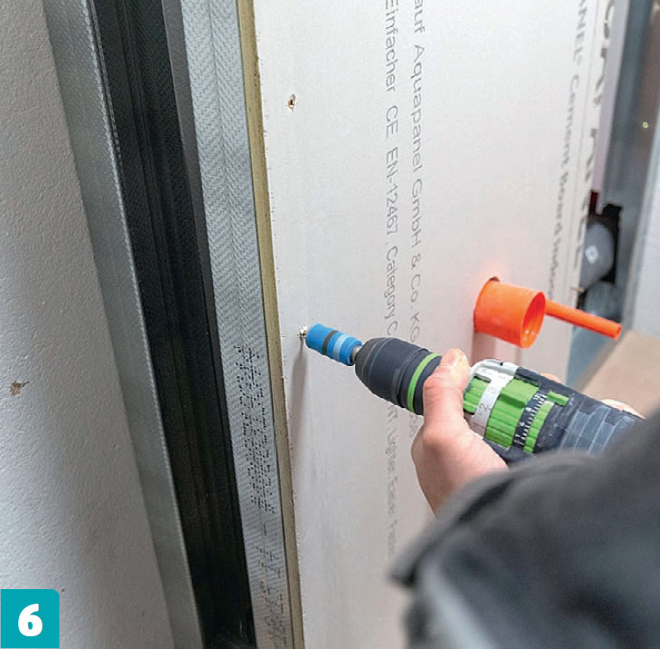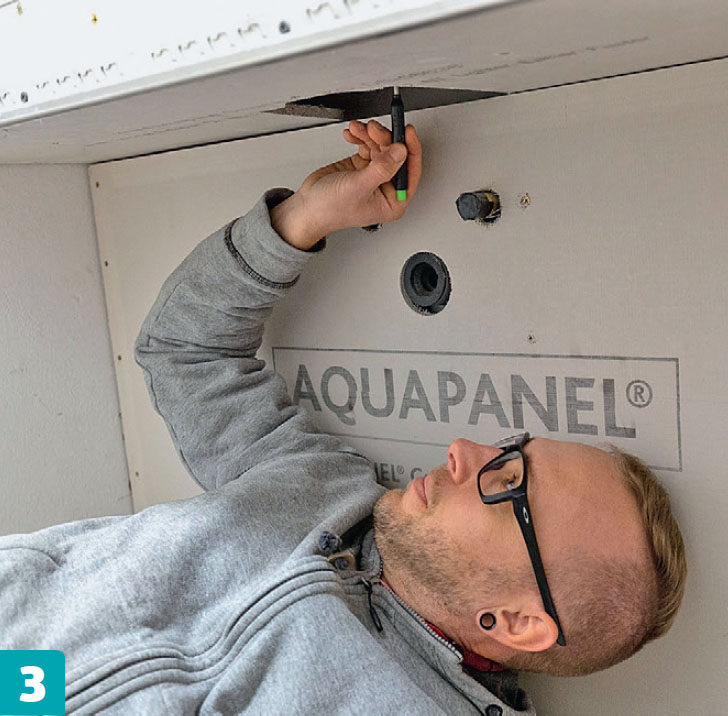 Ruuvaa etureuna kiinni sen jälkeen, kun kotelon sisäpuolen asennukset eli vesiputket ja vuotosuojat ovat paikoillaan. Kaikki levyyn tarvittavat reiät piirretään ja porataan tai sahataan takapuolelta.