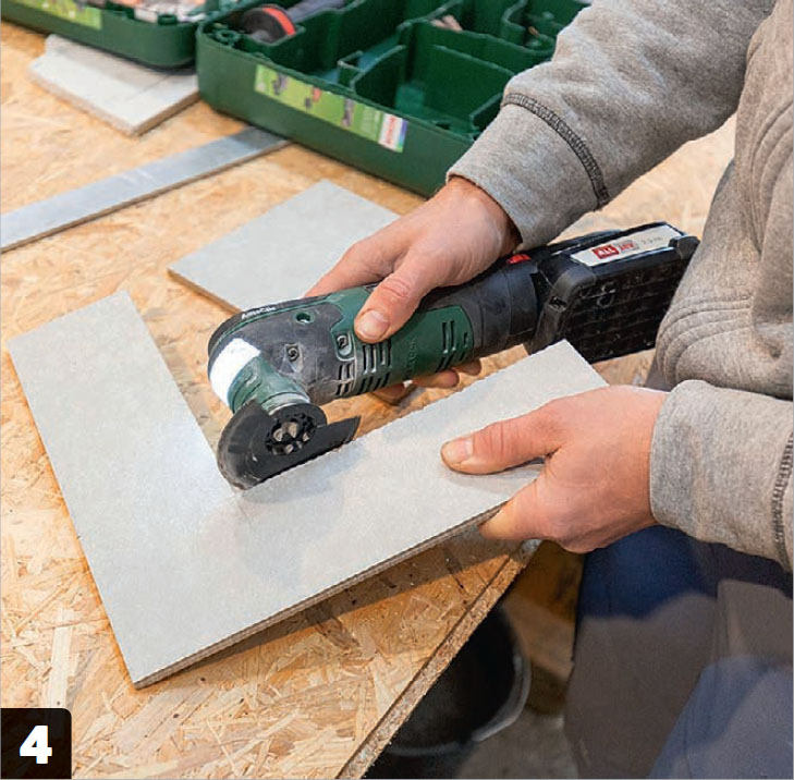 Viimeistele monitoimityökalulla. Kulmien sisäpuolet on syytä viimeistellä erityisellä laattaterällä varustetulla monitoimityökalulla. Reiät putkia varten voi porata helpoiten kulmahiomakoneen timanttiporalla.