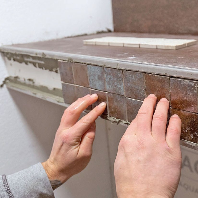 Laatoitus lattiasta kattoon ei ole hyvä idea pienessä huoneessa, koska silloin huone näyttää vieläkin pienemmältä. Sen sijaan asennamme laattoja ja viimeistelemme ne mosaiikkilaatoilla ja päätylistalla, jotta ne ovat samassa tasossa pesualtaan takana olevan roiskelevyn kanssa.