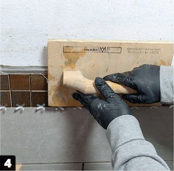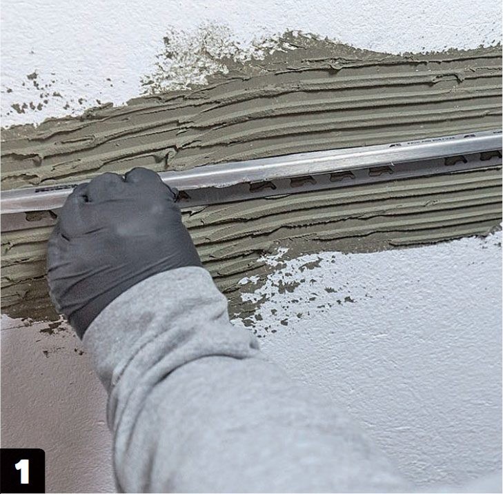 Aloita päätylistasta, joka on laattojen ja tasoitettavaksi tarkoitetun seinän välinen yhtymäkohta. Merkitse listan sijainti ja kiinnitä se paikalleen laattaliimalla. Hankaa ylimääräinen liima pois seinästä.