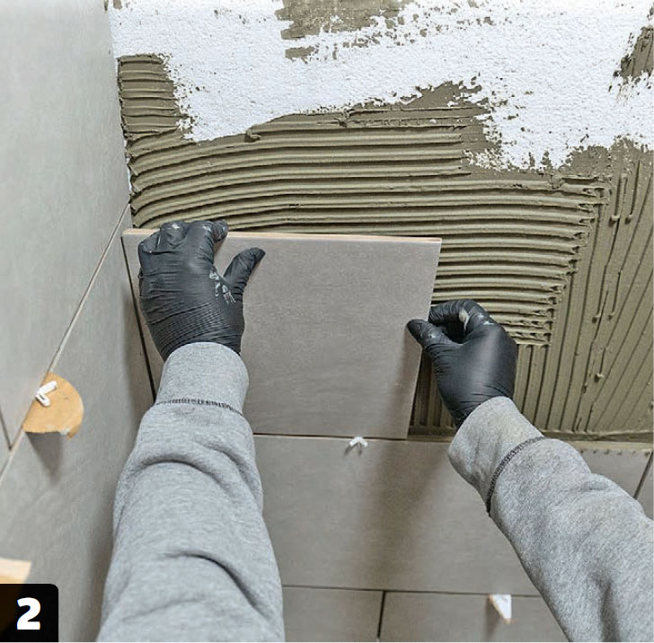 Asenna takalevy. Laatta leikataan ja takaseinään levitetään laattaliimaa ennen laatan nostamista ja kallistamista paikalleen. Paina laatta tiukasti kiinni ja tue laattaa tarvittaessa jollakin, joka pitää sitä paikallaan liiman kovettuessa.