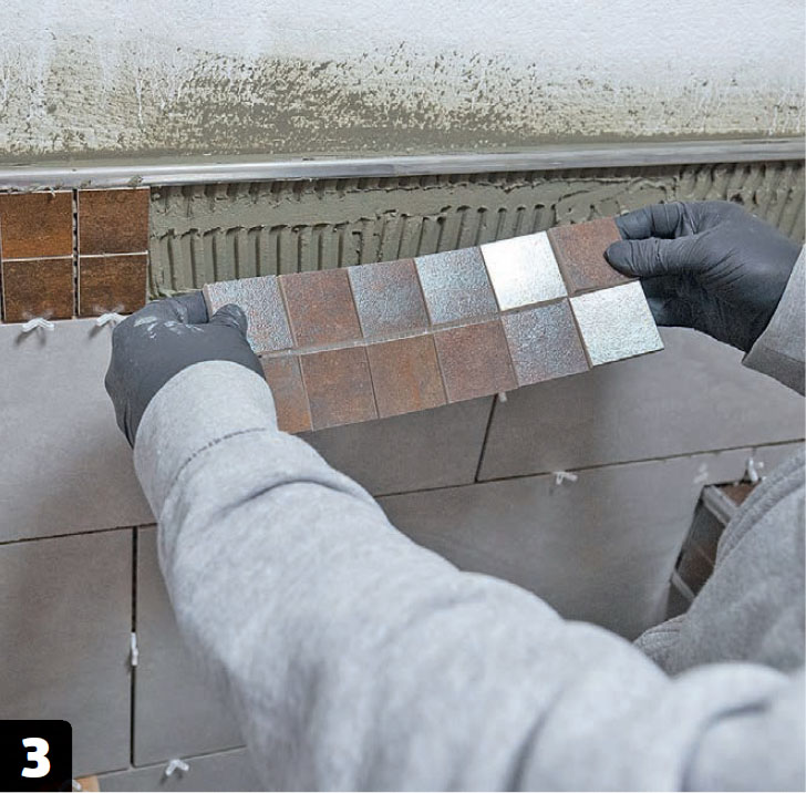 Mosaiikkilaatat kiinnitetään lopuksi. Varmista, että mosaiikkimattojen väliset saumat eivät ole muita saumoja leveämpiä tai kapeampia. Näin saat kauneimman lopputuloksen.