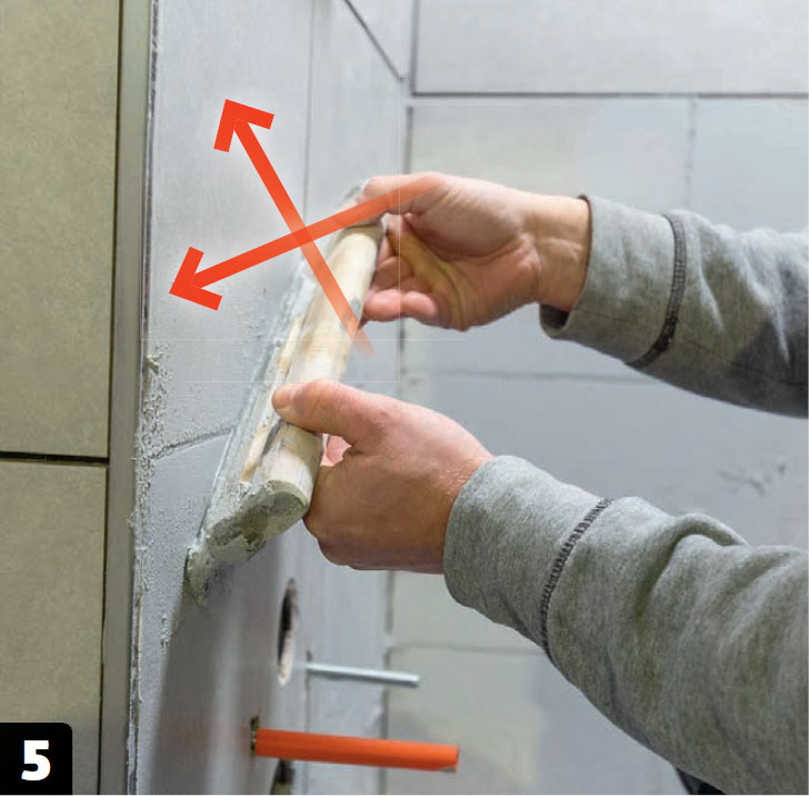 Saumauksen voi aloittaa seuraavana päivänä. Laattaliiman on annettava kovettua ennen saumausta, sillä muuten laatat voivat vääntyä. Vedä saumauslastaa viistosti saumojen päältä.