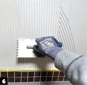 Levitä laattaliimaa hammaslastalla. Tässä on tärkeää käyttää hammaskokoa, joka soveltuu laattoihin käytettävän liiman paksuudelle. Kysy tarvittaessa neuvoa laattojen ostopaikasta.
