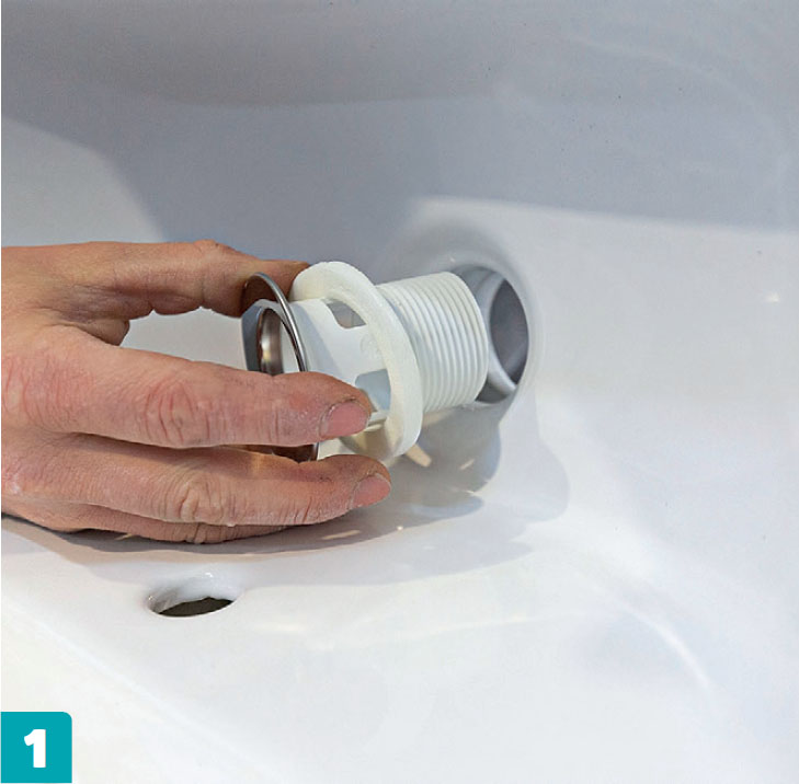Pohjaventtiili ja viemäriliitäntä ruuvataan kiinni ennen pesualtaan asentamista. Se on paljon helpompi tehdä nyt kuin myöhemmin alapuolelta käsin.