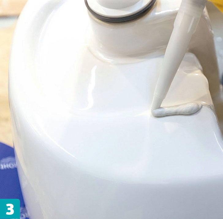 Pesuallas liimataan paikalleen saniteettisilikonilla. Tämä pesuallas on tarkoitettu asetettavaksi tasolle, ja sen pohjalle levitetään vain paksu kerros saniteettisilikonia ennen kuin se käännetään ja asetetaan paikalleen.