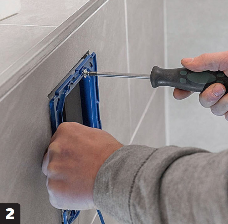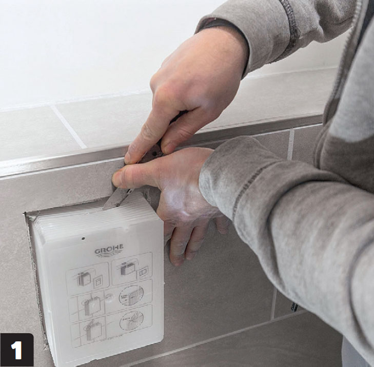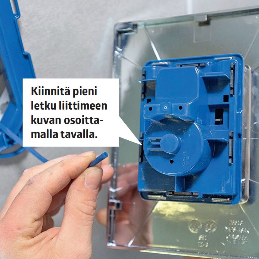 Irrota huuhtelumekanismia suojaava kääre mattoveitsellä. Leikkaa se laattojen tasalle. Noudata sen jälkeen pakkauksen ohjeita.