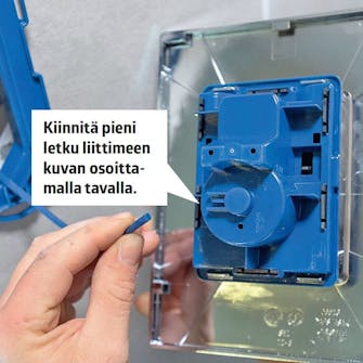 Yhdistä painonapit. Järjestelmä toimii pneumaattisesti eli ilmanpaineella, joten on tärkeää, että pieni ilmaletku on kiinnitetty oikein ja tukevasti. Muussa tapauksessa WC-istuin ei huuhtele. Liitä letku ensin vesisäiliöön ja sen jälkeen painonappien takapuolelle.