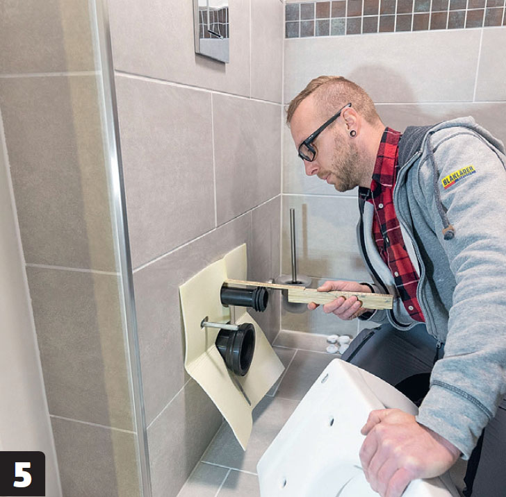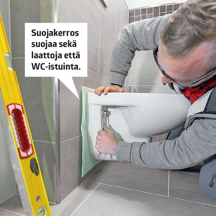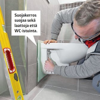 Sovita kaikki putket pituussuunnassa. Huomaa seinään kiinnitetty suoja. Se estää WC-istuinta painamasta suoraan laattoihin. Suoja leikataan lopuksi, kun WC on paikallaan.