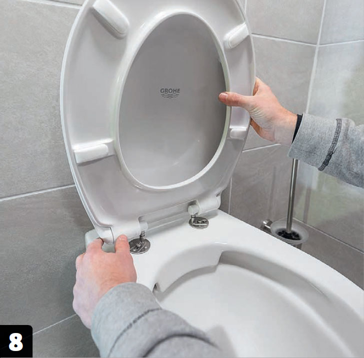 Ruuvaa WC-istuin kiinni. Kun putket on saatu sopivan pituisiksi pituussuunnassa ja WC-istuin on vaakasuorassa, se kiristetään paikoilleen. Muista, että istuin on posliinia, joten älä kiristä liikaa.