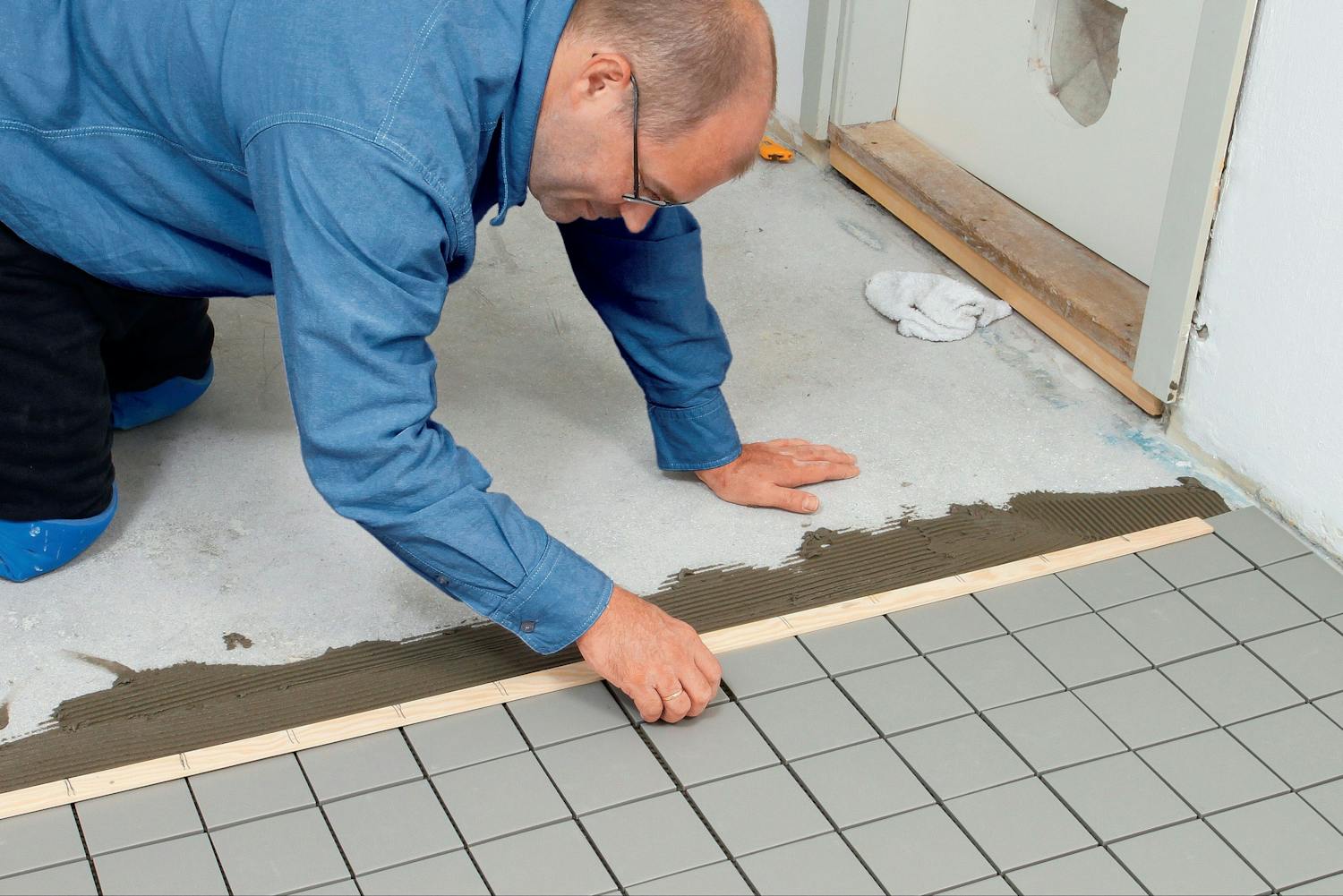 Jos aloitat laatoittamisen vinon seinän mukaan, saat vinon lopputuloksen. Voit jakaa ison lattian pieniin osiin laudoilla ja suunnitella niiden avulla, mihin vinot laatat tulevat.