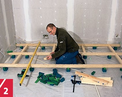 Lattianpäällysteen runkopuiden saa-minen vaakasuoraan ja niiden pitävä tukeminen ei ole aivan yksinkertainen tehtävä. Lattian aluslaatta oli pinnaltaan aika karkea ja korkeuserot suurempia kuin pintamateriaaleille sallitaan.