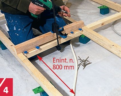 Runkopuiden (C) ja seinän väliin jätetään noin 10 mm rako, minkä voi toteuttaa muovikiiloilla. Meillä samaan tarkoitukseen sahataan puukiiloja tai levynpaloja. Ensimmäinen tukirima (E) sijoitetaan 30 cm päähän seinästä.