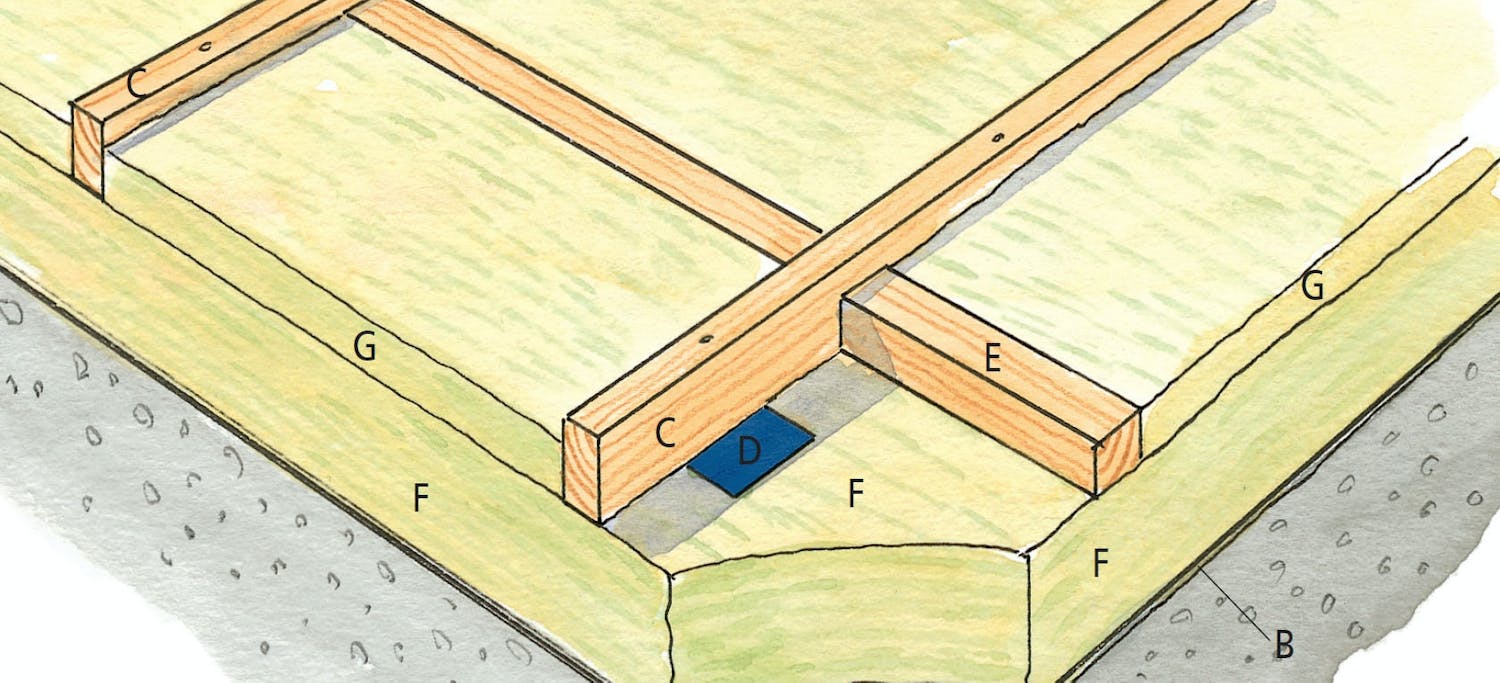 Kuvatussa työssä lattian eristys uusit-tiin. Betonilaattaa vasten kannatinsoirojen (C) välitukien (E) alle asennettiin ensin kerros villaa (F). Villa leikattiin tarkasti kannatinpalikoiden (D) ympärille.