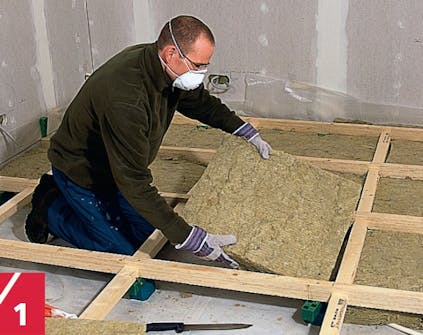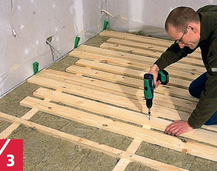 Alustasta lakaistaan tai imuroidaan roskat ja pöly pois ennen kuin askeläänieriste levitetään lattialämmityksen päälle. Roskia ei saa jäädä myöskään sen päälle. Paksu askeläänieriste asennetaan pusku-saumoin tai saumat sovitetaan alustan mataliin kohtiin.