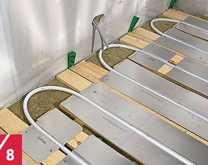 Lämmitysputket taivutetaan seinien vieressä kaarelle ja takaisin seuraavaa uraa pitkin. Päätykäännöksien tueksi on saatavan lastulevystä valmistettuja ura-levyjä, joita olisi hyvä käyttää.