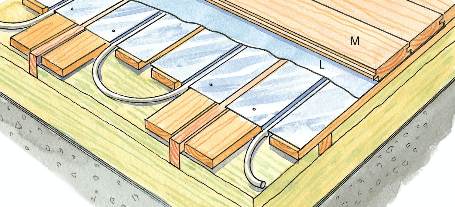 Lämmitysputket asennettiin 0,6 mm alumiinista valmistettujen lämmönjakolevyjen uriin.Lämmönjakolevyt laskettiin harvalaudoitukselle urat lautojen väliin. Käytettyjen lämmönjakolevyjen mitat olivat 280 x 1150 mm.Kuvissa ja piirroksessa nähdään, että lämmitysputkien mutkat ovat vapaana eristeen päällä, mutta käytännössä mutkien alle asennetaan lastulevyt, joihin on jyrsitty mutkien urat sekä poikittainen ura lähelle päätyreunaa, johon sijoitetaan paluuputki.