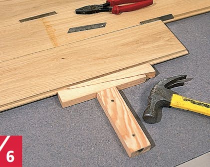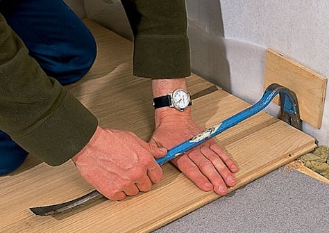 Ensimmäiset laudat kiinnitetään seinän suuntaisesti noin 10 mm etäisyydelle sei-nästä. Lattian etenemisen tasaisuutta pitää varmuuden vuoksi seurata. Sen seuraamisek-si lattian ylle ensimmäisen kahden laudan sauman kohdalle voi kiristää linjalangan, josta mittaukset tehdään.