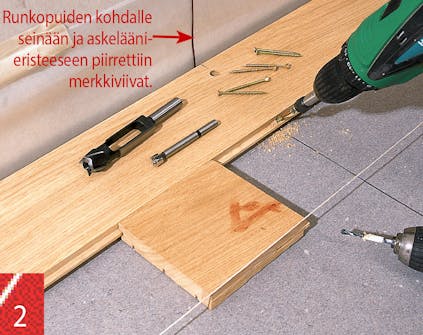 Päällyste saadaan vaakasuoraan siten, että seiniin merkitään esim. 50 cm korkeudelle vaakalinja tai merkkiviivoja. Niistä määräväli alaspäin on lattian pinta tai esim. runkopui-den yläpinta. Korkeustason voi merkitä vaakitusletkulla tai laserilla.