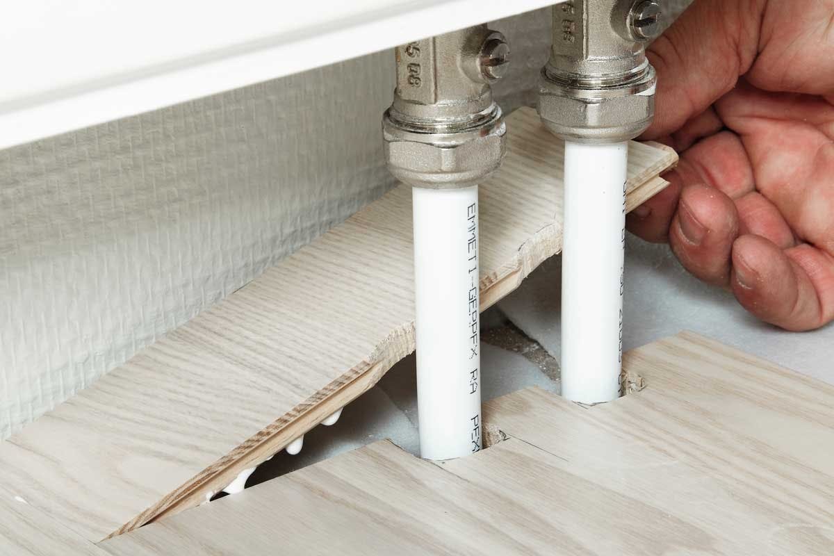 Putkia vasten asetetaan irtolauta, jotta voit mitata, merkitä ja sahata sopivan kokoisen palan. Seinän ja putken väliin asennetaan laudanpala, joka liimataan sahattuun lautaan kiinni.
