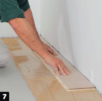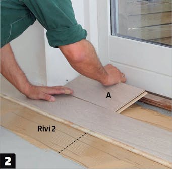 Varmista, että kahden ensimmäisen rivin laudat sopivat paikoilleen, ennen kuin liimaat ne kiinni. Jatka asentamis-ta kaksi riviä kerrallaan. Varmista lauto-jen sopivuus aina ennen liimaamista.