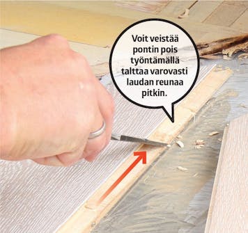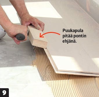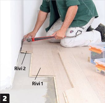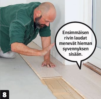 Paina ensimmäinen lauta kiinni huoneen nurkkaan. Työnnä välikapulat laudan ja seinien väliin. Paina seuraava lauta kiinni päätyponttiin ja jatka asentamista.