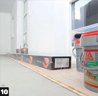 Sitten liimataan. Levitä lattialle tasai nen kerros liimaa. Käytä laastikampaa, jossa on kovametalli hampaat. Betoni kuluttaa tavallista laastikampaa.