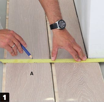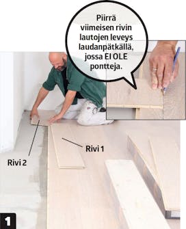 Viimeisen rivin laudat pitää halkaista, jotta ne sopivat seinän viereen. Sahaa laudat sopiviksi siinä vaiheessa, kun lattiasta puuttuu vielä kaksi riviä. Levitä viimeisen rivin laudat toiseksi viimeisen lautarivin paikalle ja piirrä halkaisulinja laudanpätkän avulla.