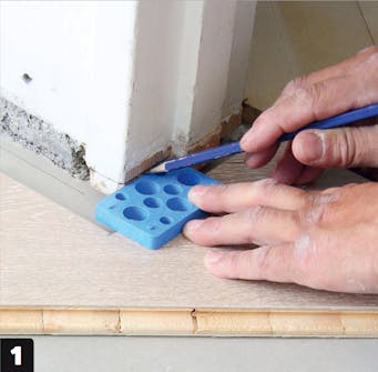 Piirrä rajaviiva. Sahaa laudasta pätkä, poista pontti ja piirrä lattiaan viiva liiman levittämistä varten. Ole tarkkana, jotta liima ei leviä rajan yli.