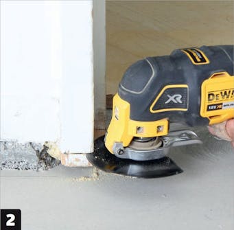 Lattian toisessa päässä on välioven aukko ja karmi. Jos asennat laudan karmin alle, sahaa sen alapäästä pätkä. Sahaamiseen kannattaa käyttää moni toimityökalua, joten osta sellainen viimeistään nyt. Osta samalla pari laadukasta terää.