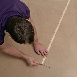 Tarkista, että korkeus on hyvä asettamalla linoleumilaatta puulattiaa vasten. Kun aluslattia on valmis, lat-tiaan kannattaa tehdä pari apuviivaa, joiden mukaan laattoja voi oikaista.