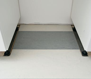 Napsauta sokkelikap-pa leet kiinni. Leikkaa ne niin, että ne sopivat uuteen lattiaan ja kattavat kaappien alaosan, mutta lattia pysyy yhä irti sokkelista voidakseen ”elää”.