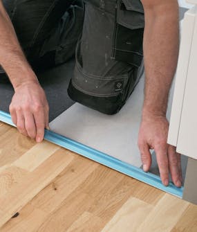 Viimeinen rivi kaapis to -jen kohdalla napautetaan paikalleen parkettirau-dal la. Jos panit vä likkeitä esim. puulattian (kuten tässä) ja lino-leu min väliin, jätä ne paikoil leen, kunnes koko lattia on asennettu.