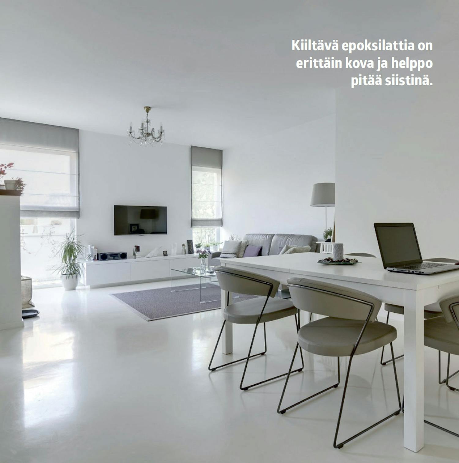 Jos aiot tehdä epoksilattian noin 10 neliön kokoiseen kylpyhuoneeseen, ehdit levittää epoksin yksin. Tilanne on kuitenkin eri, jos teet epoksilattian noin 30 neliön kokoiseen olohuoneeseen. Silloin epoksi pitää sekoittaa kahdessa osassa ja astiassa. Se tarkoittaa, että työhön tarvitaan kaksi. Heti, kun ensimmäinen epoksierä on sekoitettu, se pitää kaataa lattialle, ja toisen erän sekoittaminen pitää aloittaa heti, kun ensimmäinen on valmis.