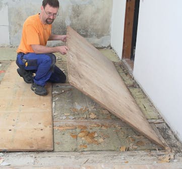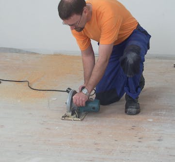 Pura vanha lattia kappaleiksi. Sijoita viillot palkkien väliin ja säädä pyörösaha tarkasti sellaiseen syvyyteen, ettet vahingossa sahaa kaapeleita ja muita vanhan lattian alle piilotettuja asennuksia.