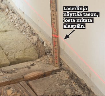 Etsi korkein kohta. Aloita oikaisemi-nen tästä korkeuspisteestä. On helpoin-ta käyttää ristilinjalaseria ja vetää vaakaviiva, josta voi ottaa mitan alaspäin. VINKKI: Jos sinulla ei ole ristiviivalaseria, käytä letkuvesivaakaa ja vesivaakaa.