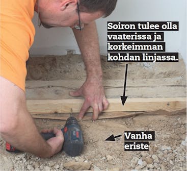 Palkkien sivuille ruuvataan soirot. Niitä käytetään alustan oikaisemiseen. Soiro-jen päälle rakennetaan aluslattia, joka kannattelee lämmönjakolevyjä ja kellu-vaa lattiaa. Tässä aluslattia tehdään muottilaudoista. Niissä ei ole pontteja ja uria, joten ne on asennettava parin milli-metrin raoin, jotta ne eivät hankaa toi-siaan vasten. Muussa tapauksessa vaarana on, että valmis lattia narisee.