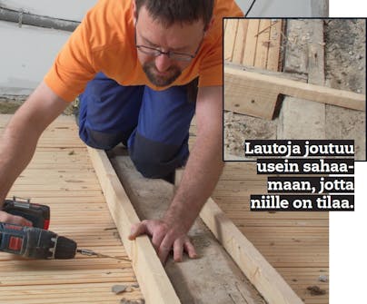 Seinää vasten tuleva viimeinen lauta on huomattavasti helpompi saada paikalleen, jos sahaat sen viistoon tämän ohjeen mukaan.